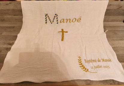 Le coloris de la double gaze de coton est au choix ainsi que les coloris de la broderie en fonction de vos souhaits et décoration.