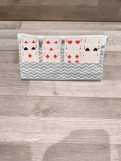 Il peut contenir 12 cartes de jeu. Il est déhoussable grâce à deux velcro cousu sur le côté il suffit d'enlever les 3 morceaux de carton qui permettent la bonne tenue du porte carte de jeu et un passage en machine à 30 degrés.