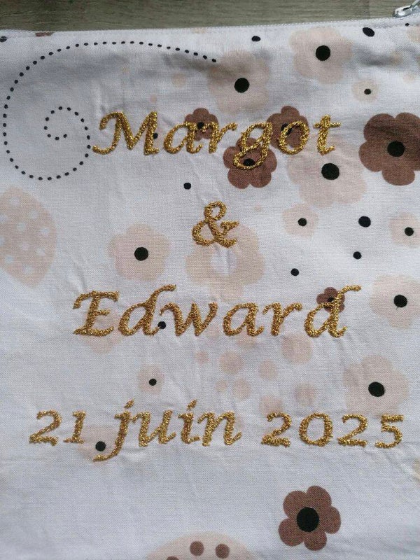 Vous êtes invité à un mariage et vous souhaitez offrir un cadeau inoubliable et qui fera plaisir à la mariée ses témoins demoiselles d'honneur coiffeuse esthéticienne etc.... Voici une trousse doublée cousue main avec des tissus Français et en 100% coton. Elle est fermée par une fermeture éclair. Elle est lavable en machine autant que nécessaire. Elle mesure 20 cm par 20 cm. Idéal pour ranger vos petites affaires, maquillage etc...Les tissus sont au choix parmi la gamme proposée n'hésitez pas à consulter la tissuthèque! Possibilité d'y broder un message, un prénom.