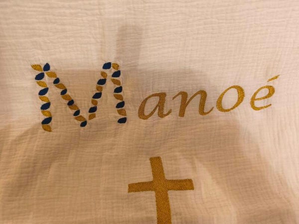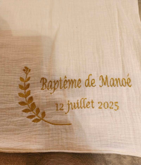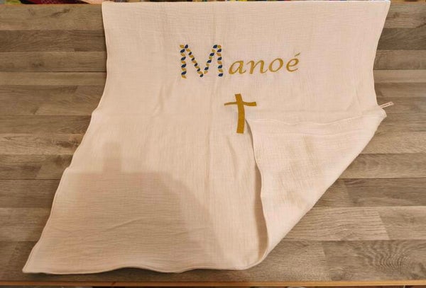 Le coloris de la double gaze de coton est au choix ainsi que les coloris de la broderie en fonction de vos souhaits et décoration.