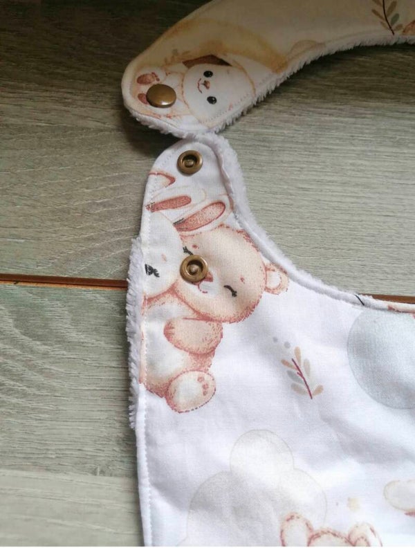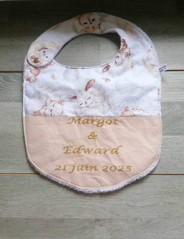 Bavoir + cousus main avec des tissus Français! Il possède une face en 100% coton et une face en éponge de bambou pour plus de douceur! Il est fermé par deux pressions pour être évolutif! Idéal pour un cadeau de naissance! La personnalisation est réalisée selon le prénom de l'enfant!Il sera brodé. Tarif : 12.50 euros pièce HFDP