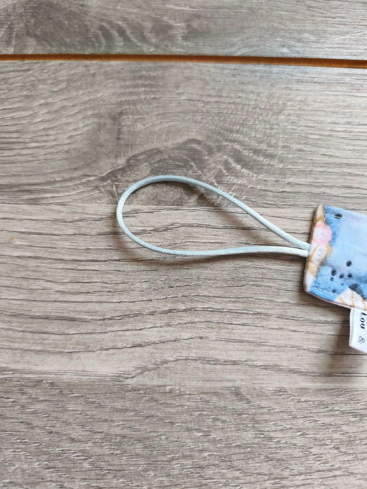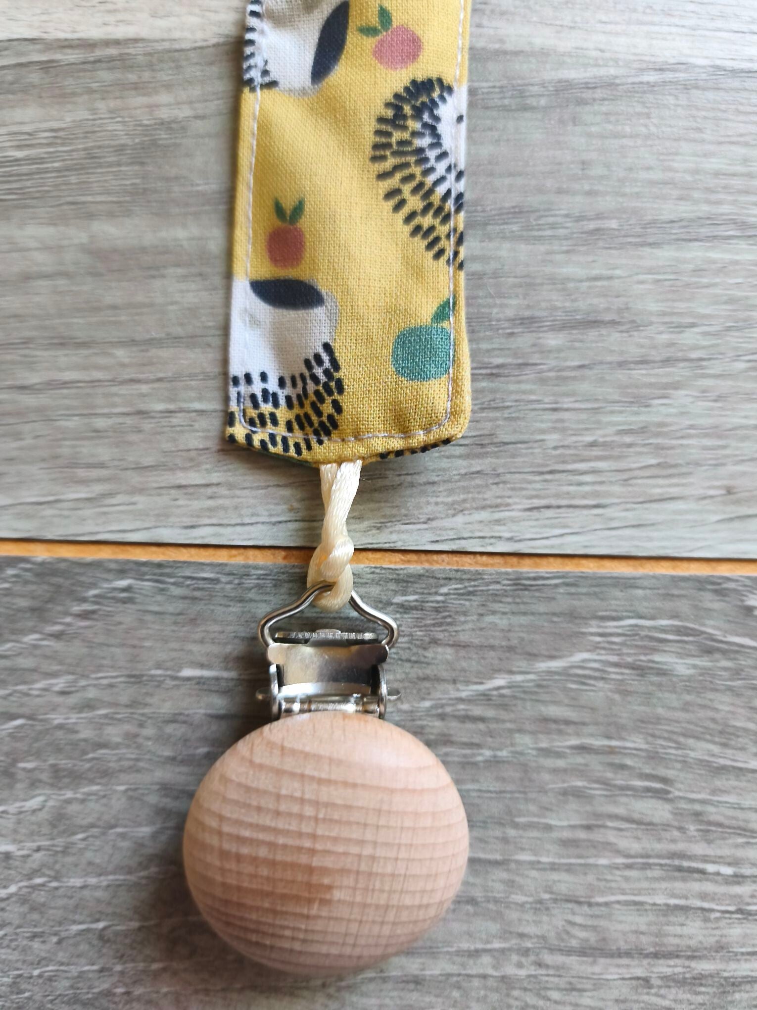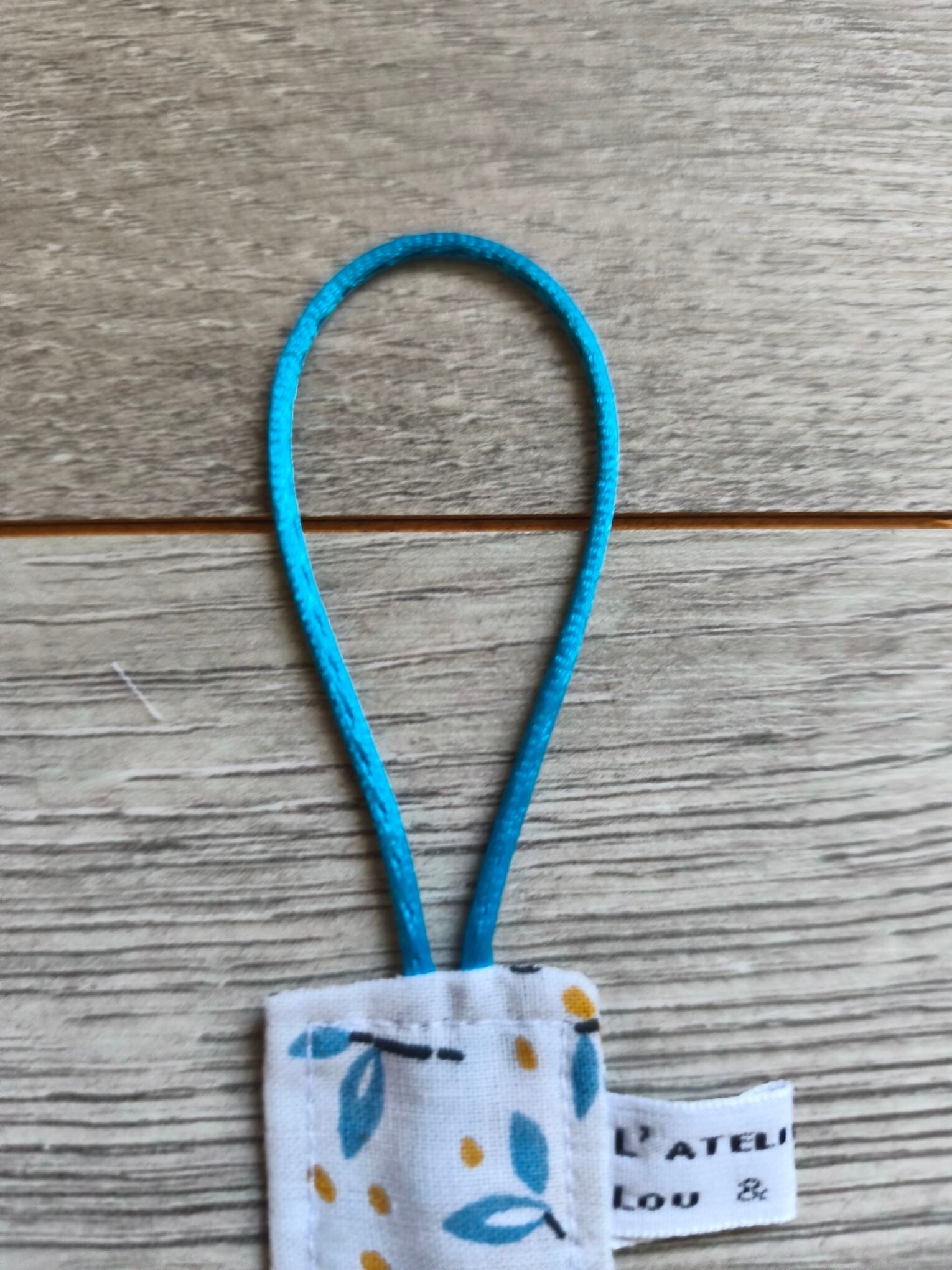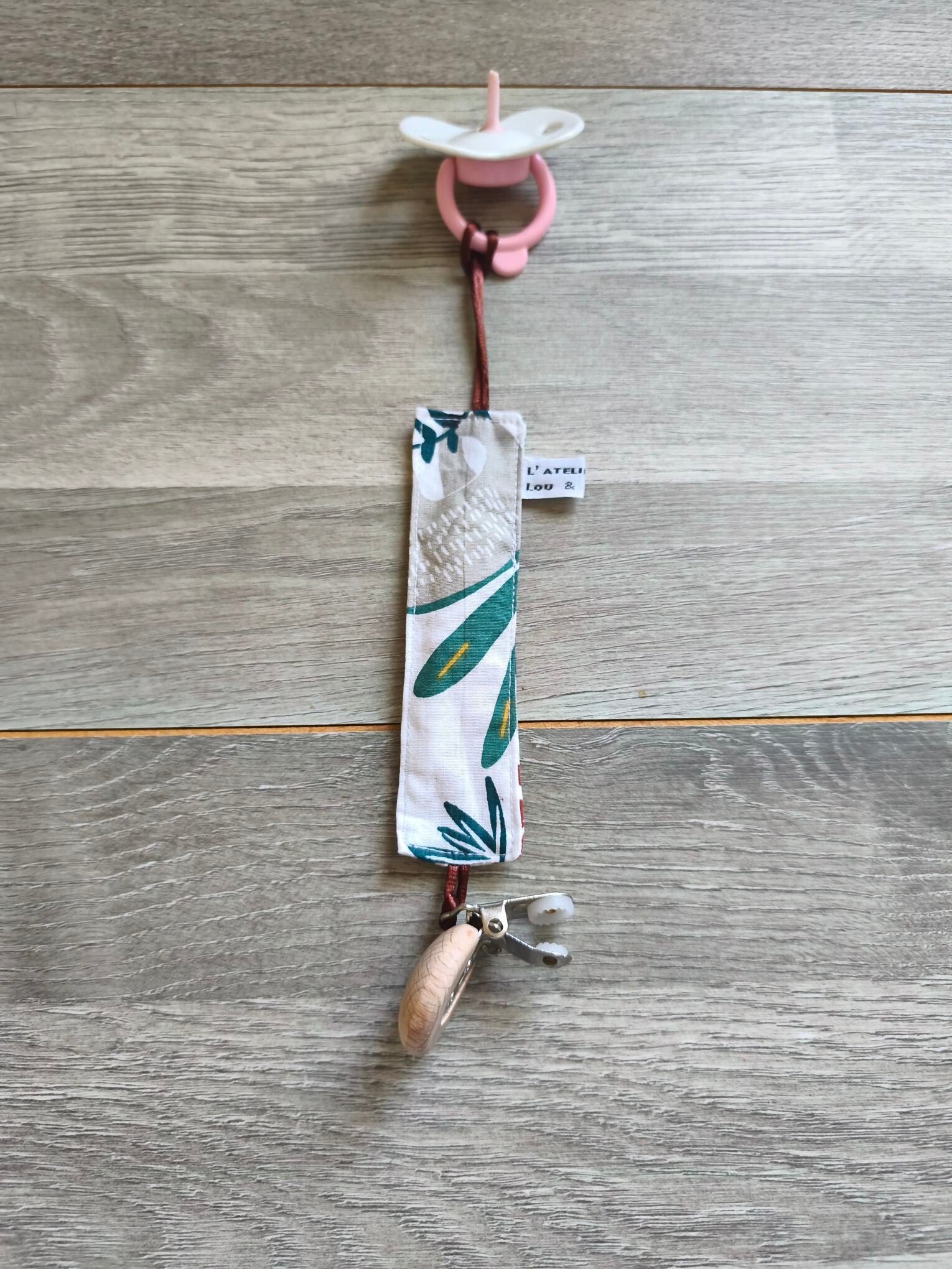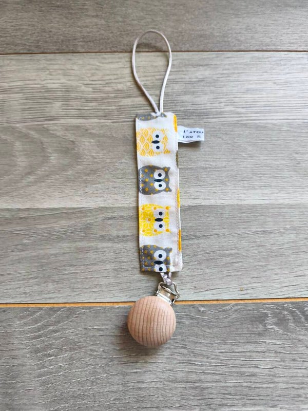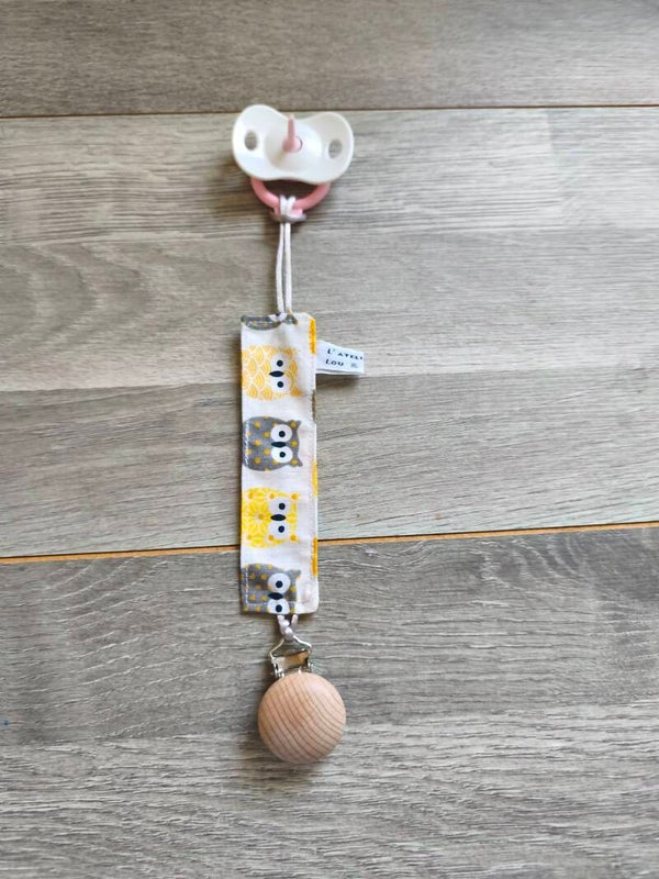 Accroche suce cousu main avec des tissus Français! Il possède une bande en 100% coton, à une extrémité une pince afin de l'accrocher sur le vêtement et à l'autre extrémité une boucle en queue de rat pour y nouer la suce de votre enfant! Fini les suces perdues! Cadeau idéal pour une naissance!