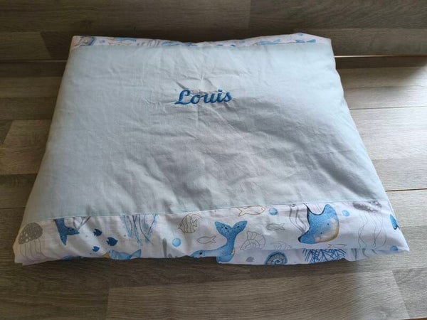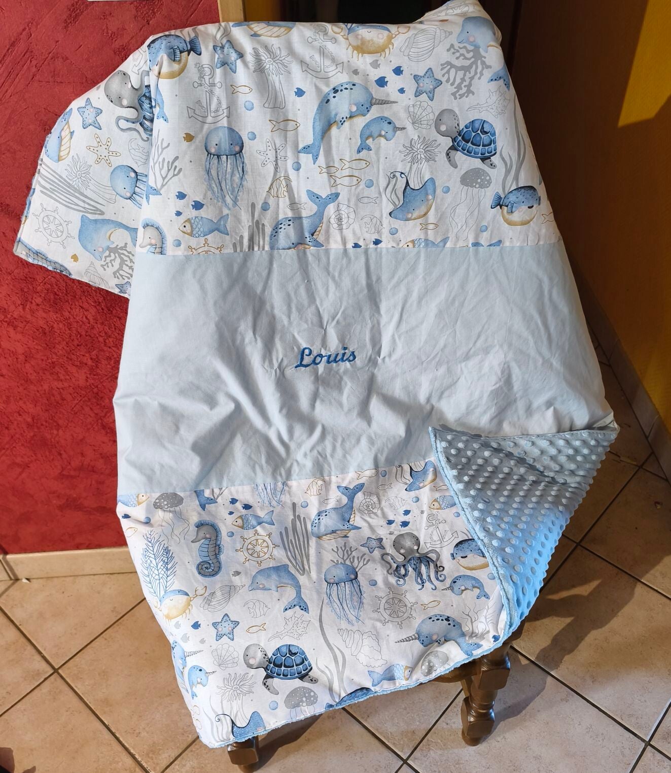 - 1 couverture 1 mètre par 1 mètre. Elle est composée d'une face en 100% coton, d'un face en minky et entre les deux une couche de ouatine pour le côté douillet. Idéal pour tenir bébé bien au chaud.