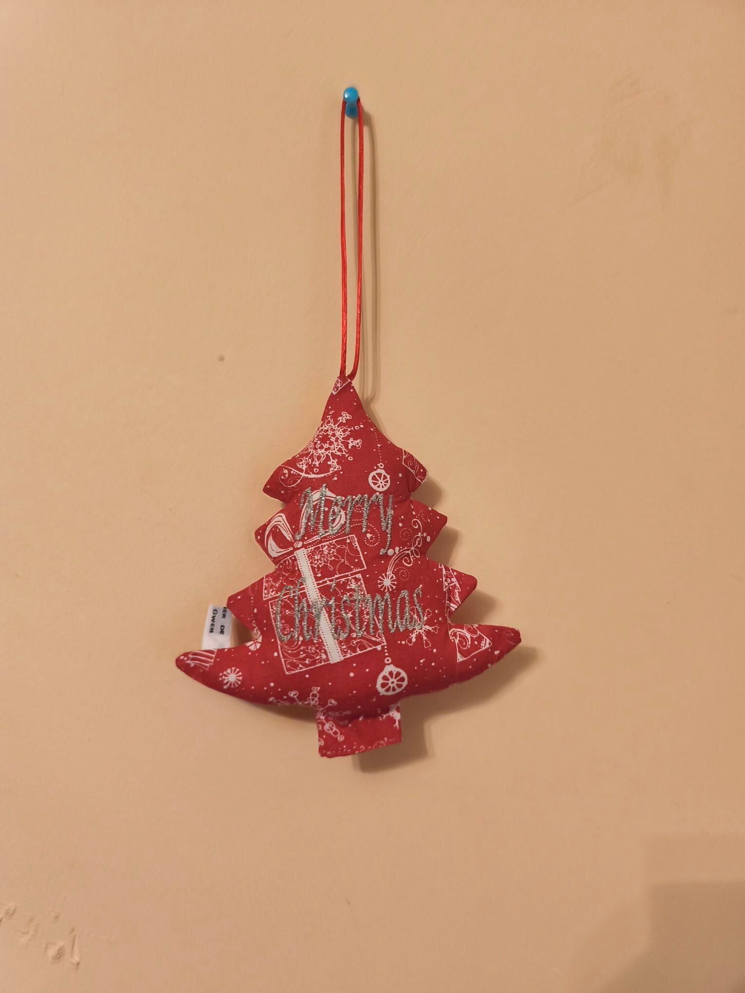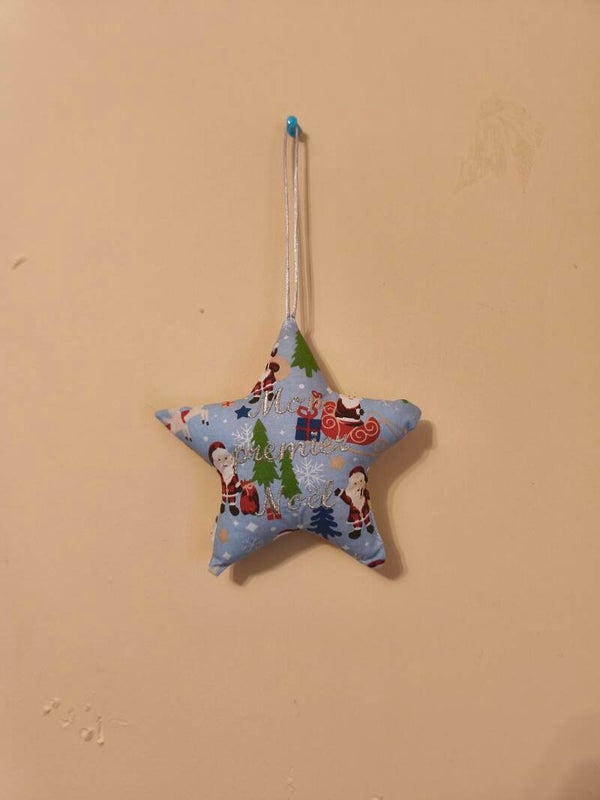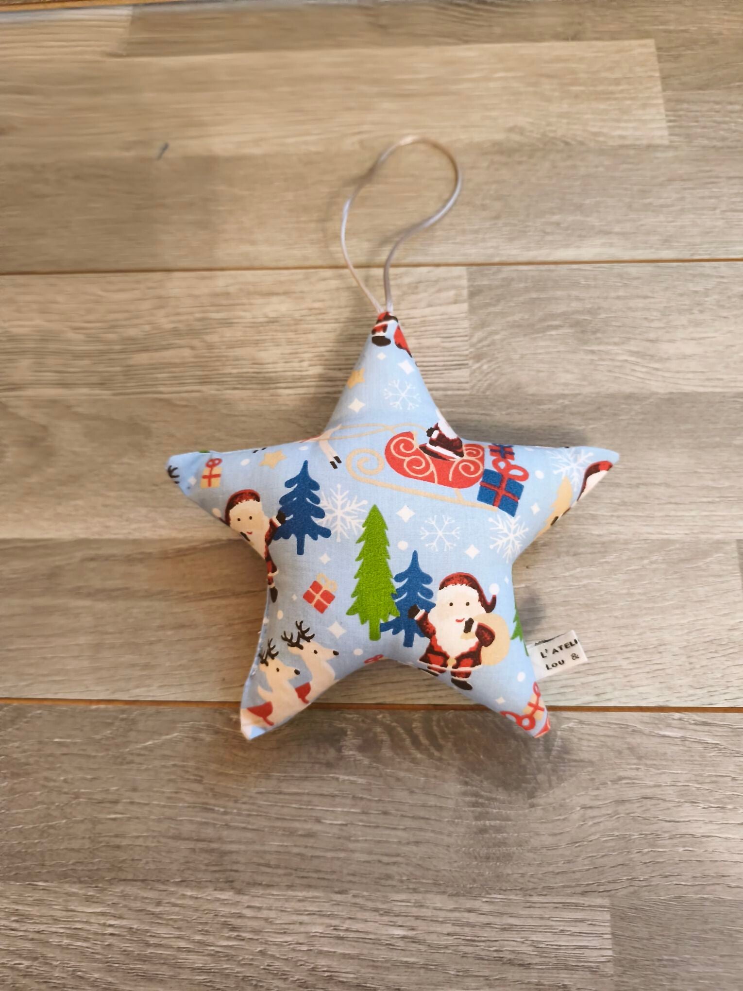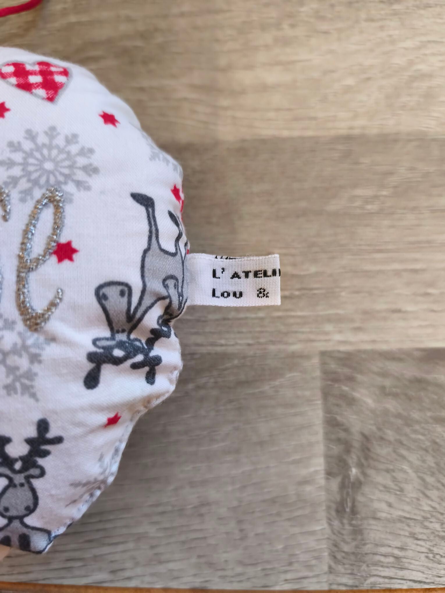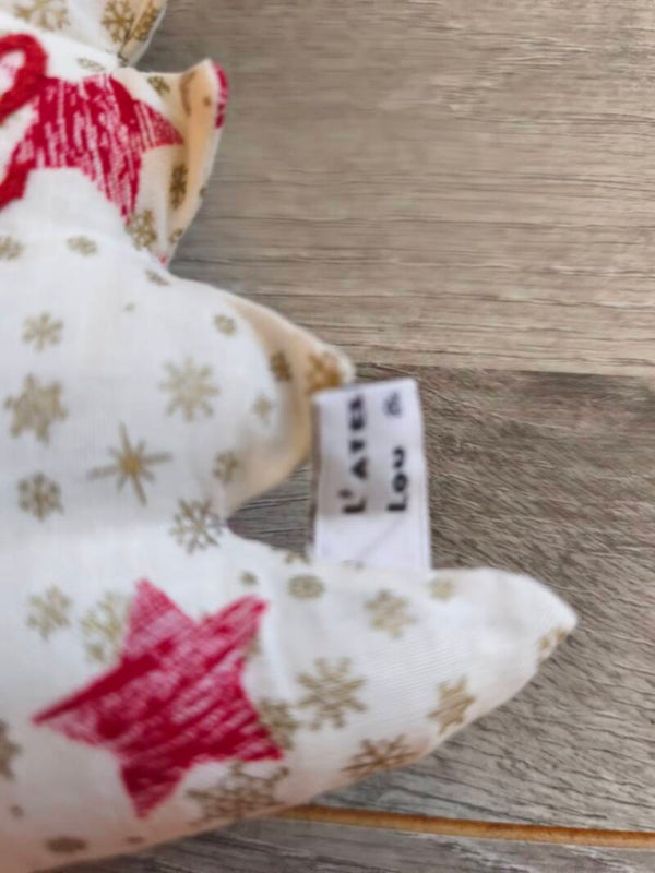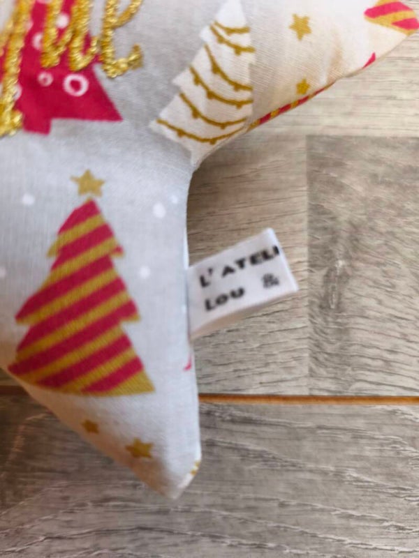 Jolies suspensions de Noël cousues main avec des tissus Français et en 100% coton. Elles sont rembourrées par de la ouate anti-acarien. Vous pourrez les suspendre grâce à leurs queues de rat. Le prénom sera brodé. Cadeau idéal à glisser sous le sapin.